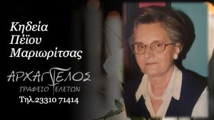 Έφυγε από τη ζωή και κηδεύεται το Σάββατο 1 Φεβρουαρίου 2025 στις 1.00 μ.μ. από τον Ιερό Ναό Αγίου Νικολάου Φυτειάς η Μαριωρίτσα Πέϊου σε ηλικία 83