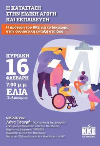 Εκδήλωση ΚΚΕ για την Ειδική Αγωγή και ΕκπαίδευσηΚυριακή 16 Φλεβάρη, 7 μ.μ., Πολυχώρος ΕΛΙΑ στη Βέροια