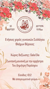 Σας προσκαλούμε τη Δευτέρα 10 Μαρτίου στις 6 το απόγευμα στον ετήσιο χορό των γυναικών του Συλλόγου μας στη Sala Elia Veria με την ορχήστρα του…