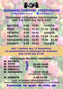 Ο Εμπορικός Σύλλογος Αλεξάνδρειας ανακοίνωσε το θερινό ωράριο λειτουργίας των καταστημάτων, το οποίο θα ισχύει από την 1η Απριλίου έως τις.