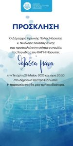 Ο Δήμος Ηρωικής Πόλεως Νάουσας σας προσκαλεί στην ετήσια συναυλία της Χορωδίας του ΚΑΠΗ Δήμου Νάουσας με τίτλο «Θάλασσα Μάνα», η οποία θα..