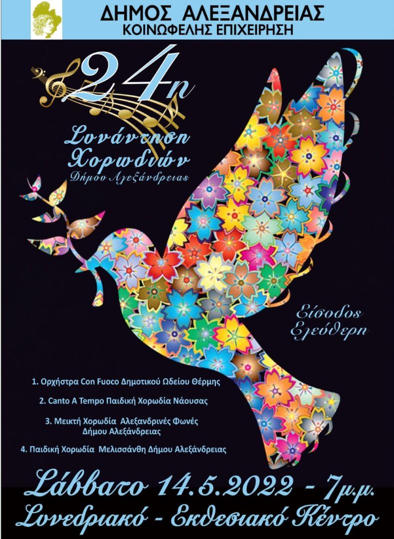 Η Κοινωφελής Επιχείρηση του Δήμου Αλεξάνδρειας σας προσκαλεί στην 24η Συνάντηση Χορωδιών το Σάββατο 14 Μαΐου 2022 και ώρα 19:00 στο Πνευματικό Πολιτιστικό Κέντρο Αλεξάνδρειας.