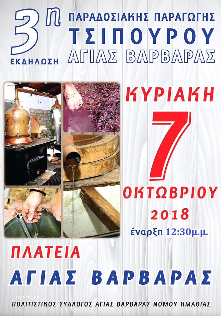 O πρόεδρος και τα μέλη του Δ.Σ. του Πολιτιστικός Σύλλογος Αγίας Βαρβάρας, σας προσκαλούνε, την Κυριακή 7 Οκτωμβριού 2018 στην 3η Εκδήλωση Παραδοσιακής Παραγωγής Τσίπουρο Αγίας Βαρβάρας, στην πλατεία της Αγίας Βαρβάρας, στις 12:30μ.μ. …