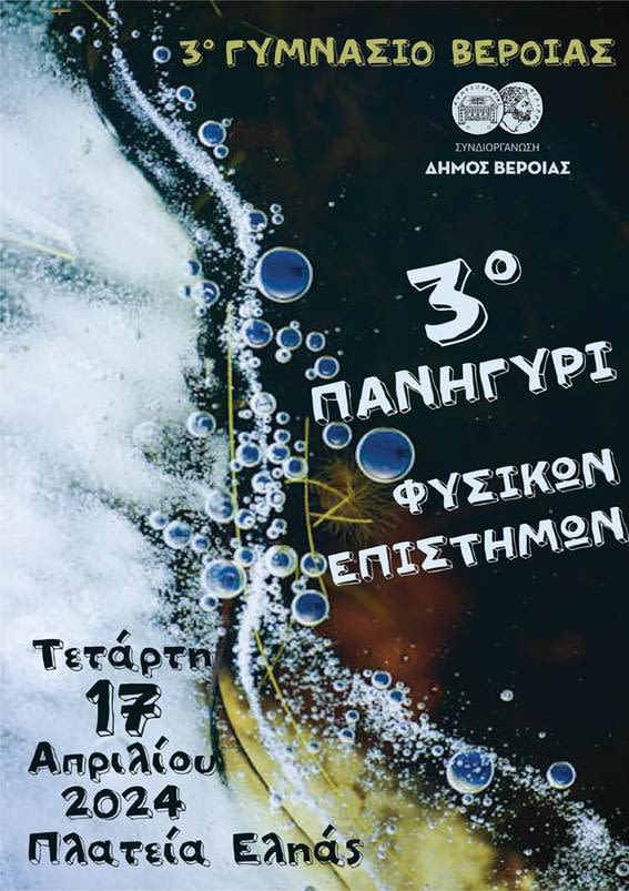 Το 3ο Γυμνάσιο Βέροιας συνδιοργανώνει με τον Δήμο Βέροιας, για άλλη μια χρονιά, ανοικτή εκδήλωση με τίτλο «3ο Πανηγύρι Φυσικών Επιστημών», την Τετάρτη 17 Απριλίου 2024, στην πλατεία Εληάς της Βέροιας και από ώρα 10:00 έως 14:00.