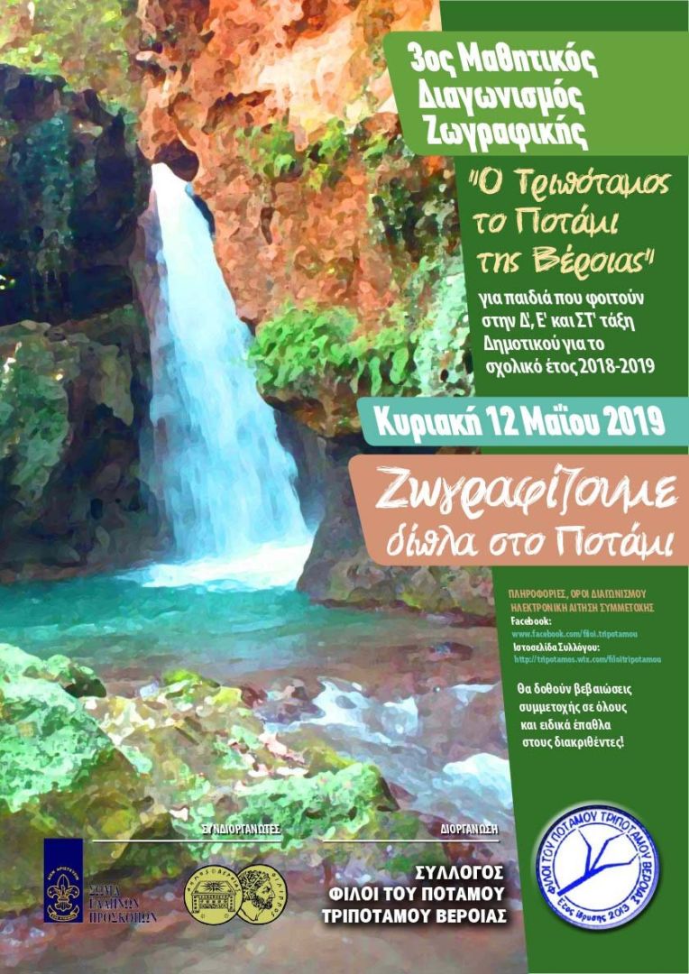 Ο Σύλλογος «ΦΙΛΟΙ ΤΟΥ ΠΟΤΑΜΟΥ ΤΡΙΠΟΤΑΜΟΥ ΒΕΡΟΙΑΣ» διοργανώνει διαγωνισμό ζωγραφικής με θέμα το ποτάμι της πόλης μας. Απευθύνεται σε παιδιά που φοιτούν το σχολικό έτος 2018-2019 στην Τετάρτη, Πέμπτη και Έκτη δημοτικού.