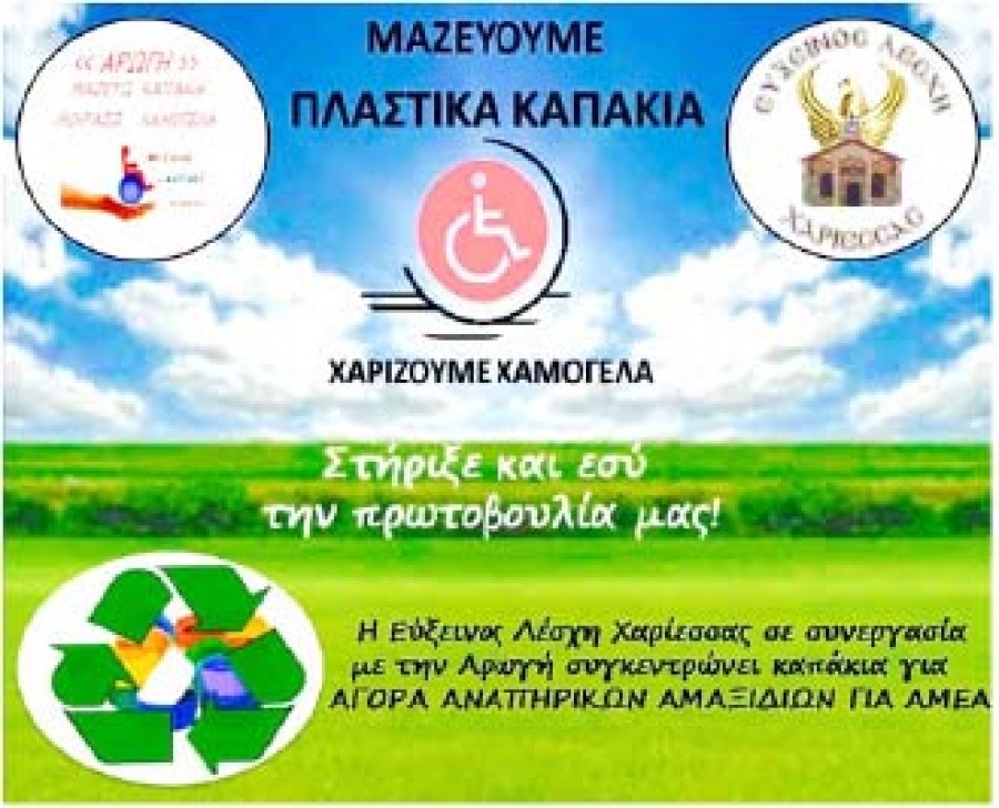 Η Εύξεινος Λέσχη Χαρίεσσας στα πλαίσια κοινωνικής προσφοράς και αλληλεγγύης ξεκινά επίσημα τη συνεργασία της με τον σύλλογο ατόμων με αναπηρία “ΑΡΩΓΗ” συλλέγοντας πλαστικά καπάκια για την αγορά αναπηρικών αμαξιδίων για ΑΜΕΑ. Η συλλογική συνεργασία και η μαζική προσφορά αγάπης, μέσα από μια διαρκώς διευρυνόμενη αντίληψη και αλυσίδα αλληλεγγύης στις μέρες που διανύουμε σώζει ανθρώπους και ζωές! “Μαζεύουμε καπάκια…Χαρίζουμε Χαμόγελα” είναι το μήνυμα που στέλνει η Εύξεινος Λέσχη Χαρίεσσας καθιερώνοντας τη συγκέντρωση – συλλογή απο πλαστικά καπάκια όλο το χρόνο και καλεί μικρούς και μεγάλους να στηρίξουν αυτή την πρωτοβουλία.