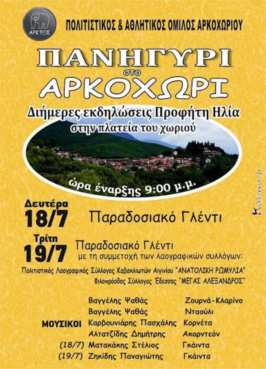 Διήμερες πολιτιστικές εκδηλώσεις προγραμματίζει και φέτος το δ.σ. του Πολιτιστικού και Αθλητικού Ομίλου Αρκοχωρίου “Άρκτος” ενόψει της γιορτής του Προφήτη Ηλία. Το διήμερο είναι στις 18 και 19 Ιουλίου και οι εκδηλώσεις θα γίνουν στην πλατεία του χωριού.