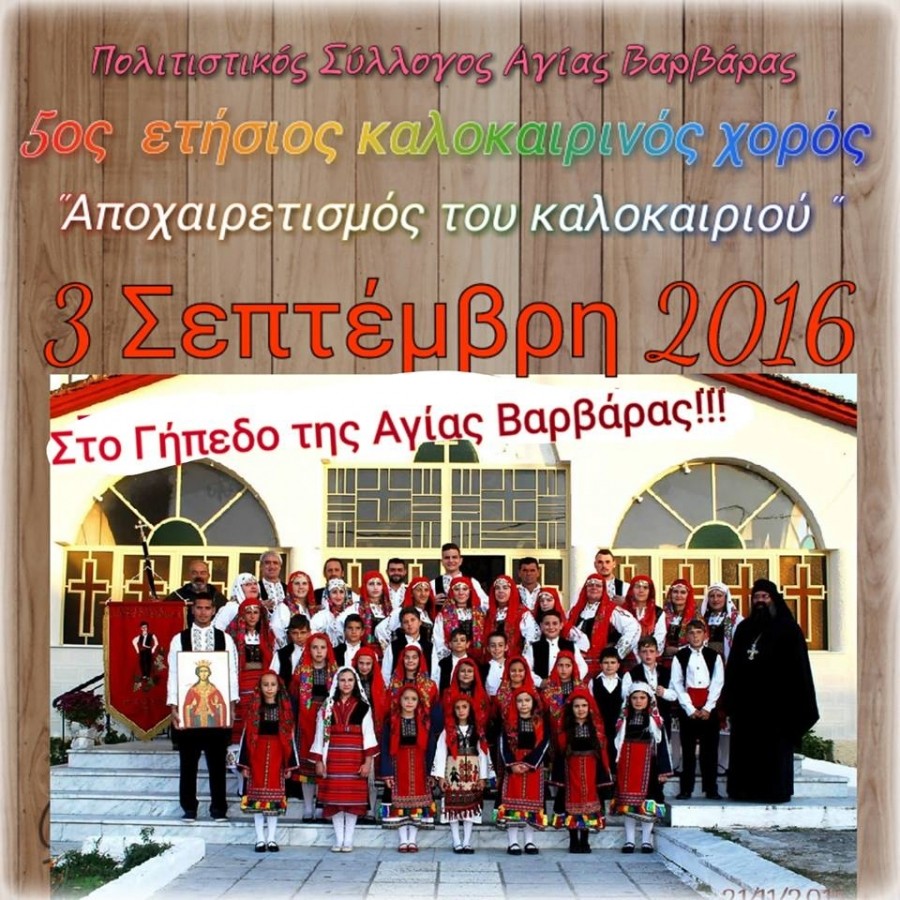 Μπορεί να είμαστε ακόμα στη μέση του καλοκαιριού όμως οι διοργανώσεις εκδηλώσεων χρειάζονται χρόνο και προετοιμασία. Έτσι, Ο Πολιτιστικός Σύλλογος Αγίας Βαρβάρας που ιδρύθηκε το 1977, ξεκίνησε  τη διοργάνωση  του 5ου ετήσιου καλοκαιρινού  χορού “Αποχαιρετισμό του καλοκαιριού ” που θα γίνει στις 3 Σεπτεμβρίου 2016, στο γήπεδο της Αγίας Βαρβάρας….