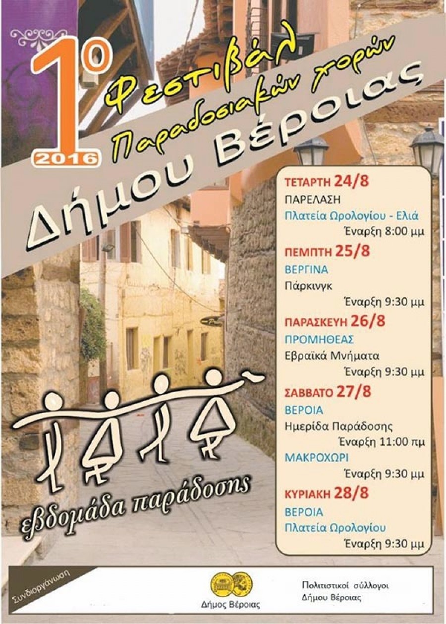 Την Τετάρτη 24 Αυγούστου ξεκινά το 1ο φεστιβάλ παραδοσιακών χορών δήμου Βέροιας, που θα διαρκέσει μέχρι την Κυριακή 28 του ίδιου μήνα.