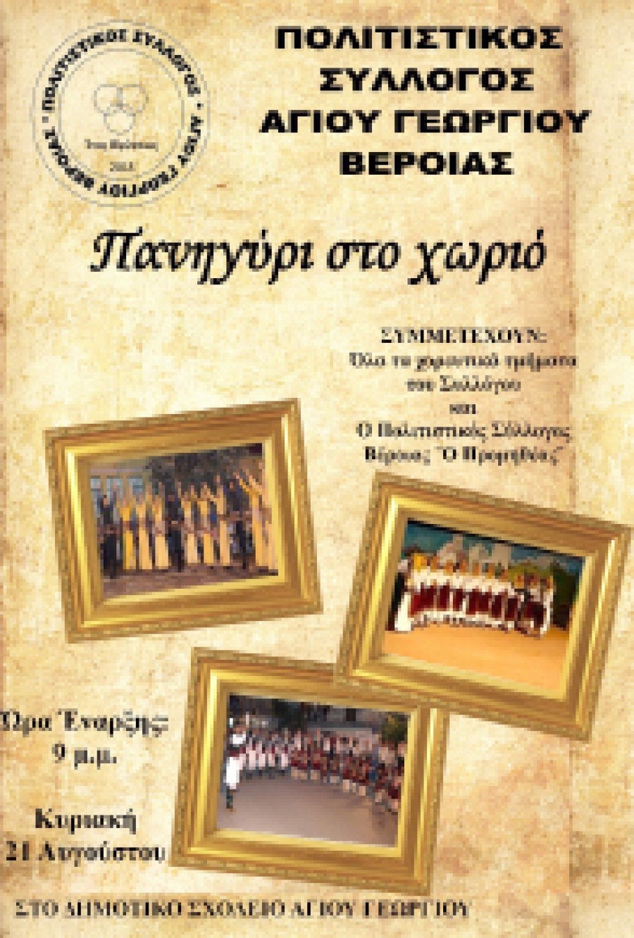 Ο Πολιτιστικός Σύλλογος Αγίου Γεωργίου Βέροιας διοργανώνει μουσικοχορευτικές εκδηλώσεις του, στα πλαίσια της πανήγυρης του Ι.Ν. Κοιμήσεως της Θεοτόκου, την Κυριακή στις 21 Αυγούστου στις 9.00 μ.μ. στον προαύλιο χώρο του δημοτικού σχολείου Αγίου Γεωργίου Βέροιας. Σύσσωμο το τμήμα παραδοσιακού χορού του τοπικού Συλλόγου και του Πολιτιστικού Συλλόγου Βέροιας “Ο Προμηθέας” θα παρουσιάσουν ένα ολοκληρωμένο πρόγραμμα με μουσικές της Μικράς Ασίας, του Πόντου και της Μακεδονίας.