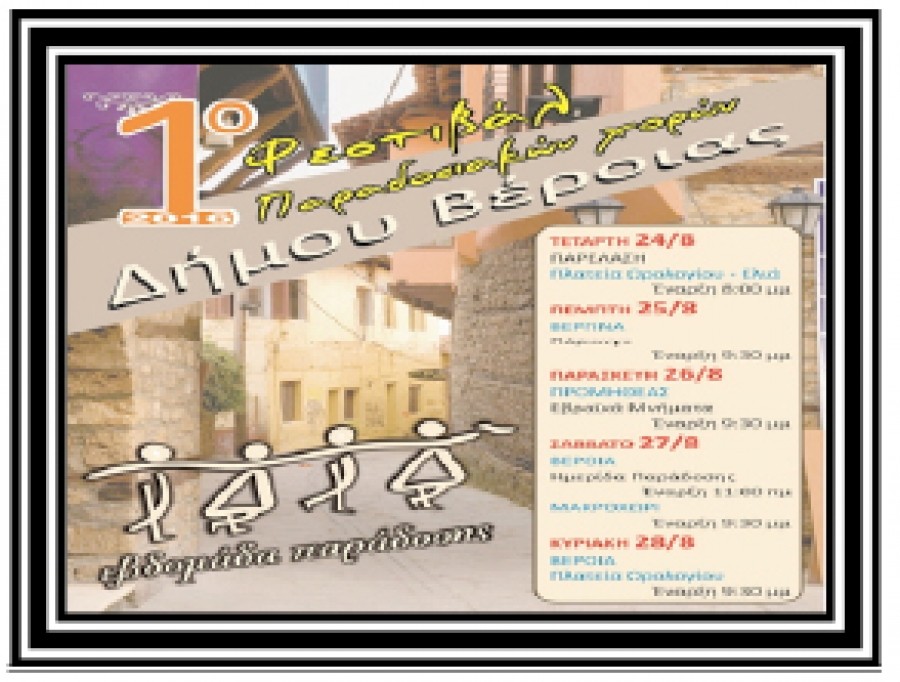 Μια εβδομάδα παράδοσης αποτελεί, το πρώτο φεστιβάλ παραδοσιακών χορών που διοργανώνει ο Δήμος Βέροιας από τις 24 έως τις 28 Αυγούστου.
