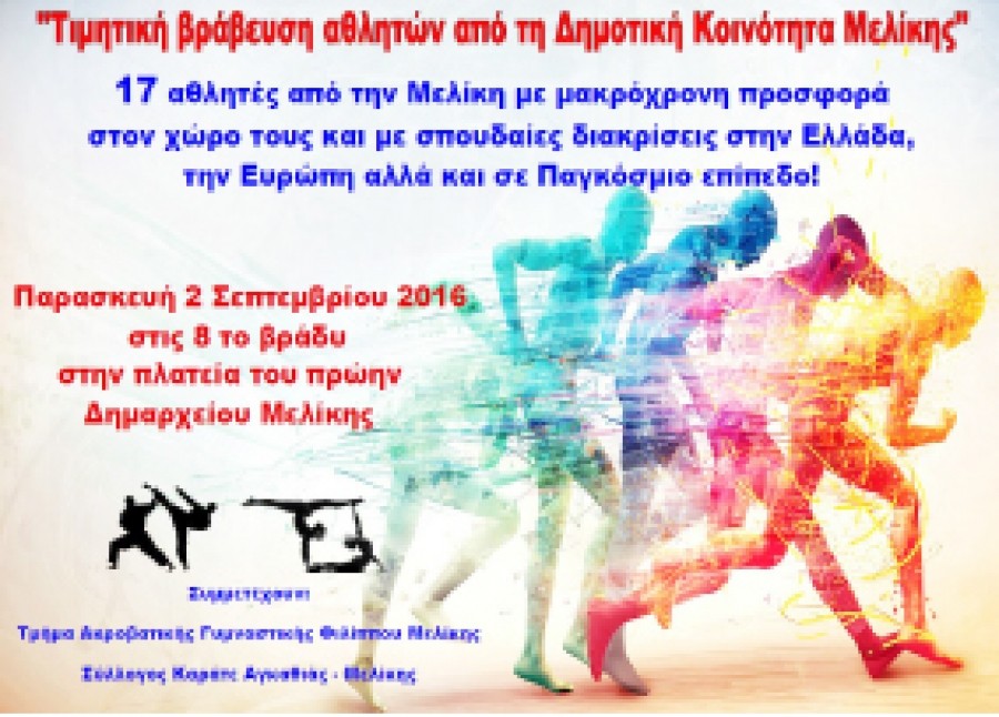 17 υπέροχους αθλητές τιμάει την Παρασκευή 2 Σεπτεμβρίου 2016 η Δημοτική Κοινότητα Μελίκης, στα πλαίσια των 4ήμερων εκδηλώσεων του «Μελικιώτικου πανηγυριού», σε μια όμορφη εκδήλωση. Αθλητές που πρόσφεραν τα μέγιστα στον αθλητισμό του τόπου μας αλλά και της χώρας γενικότερα. Αθλητές που με τα επιτεύγματά τους έκαναν την Ευρώπη αλλά και ολάκερο τον κόσμο σε κάποιες περιπτώσεις, να ψάχνει στους χάρτες για την υπέροχη κωμόπολή μας. Ακροβατική γυμναστική, μπάσκετ, ποδόσφαιρο, βόλεϊ, χάντμπολ, σκι, στίβος και πολλοί άλλοι τομείς που θα μας κάνουν να μάθουμε, να θυμηθούμε, να νιώσουμε υπερήφανοι.