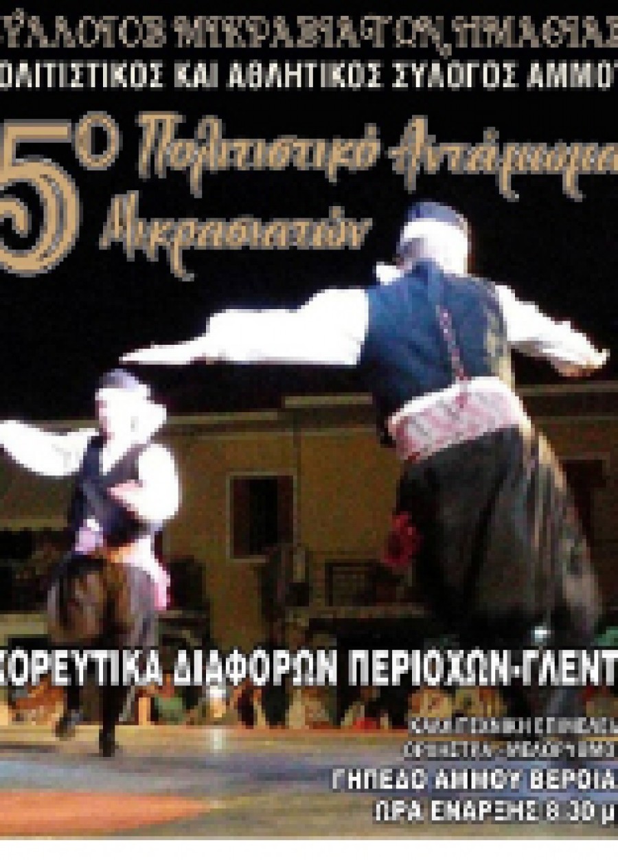 Ο Σύλλογος Μικρασιατών Ημαθίας και ο Πολιτιστικός κ’ Αθλητικός Σύλλογος Άμμου  με τη συμμετοχή της Περιφερειακής Ενότητας Ημαθίας , διοργανώνει το Σάββατο 3 Σεπτεμβρίου 2016 στις 8:30μμ στο γήπεδο του Άμμου, το 5ο Πολιτιστικό Αντάμωμα Μικρασιατών. Συμμετέχουν στο καλλιτεχνικό πρόγραμμα Πολιτιστικός Σύλλογος Θρακιωτών και Μικρασιατών Δήμου Κοζάνης (Ελλησπόντου) ,Πολιτιστικός Σύλλογος Βεργίνας «Αιγές»,Πολιτιστικός Σύλλογος Αγίου Γεωργίου,Σύλλογος Μικρασιατών Ν. Ημαθίας.Καλλιτεχνική επιμέλεια ορχήστρα «Μελορυθμοί».Η ΕΙΣΟΔΟΣ στην εκδήλωση είναι ΕΛΕΥΘΕΡΗ.