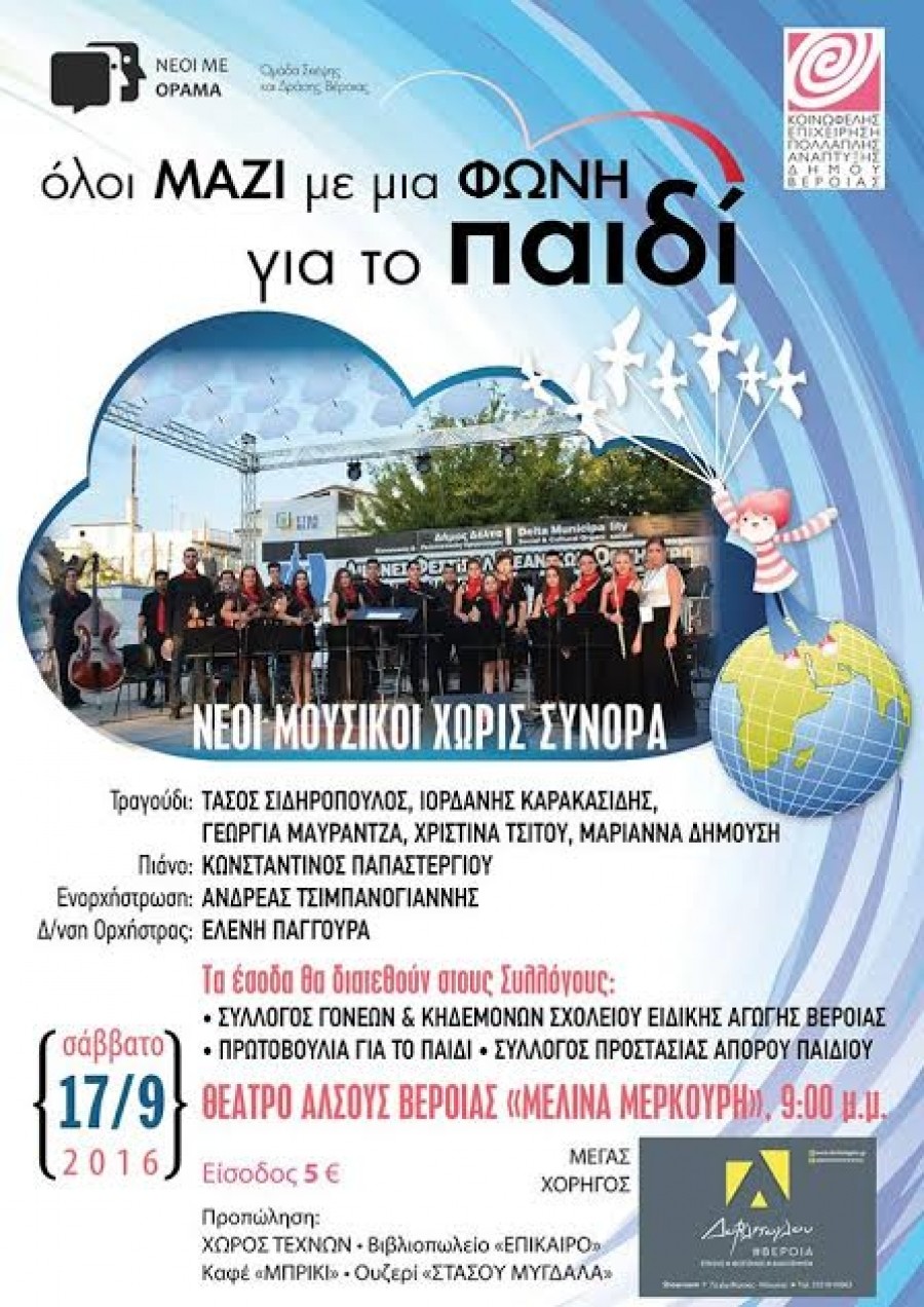 Συναυλία τα έσοδα της οποίας θα διατεθούν στον Σύλλογο Γονέων & Κηδεμόνων Σχολείου Ειδικής Αγωγής Βέροιας, στην Πρωτοβουλία για το παιδί και τον Σύλλογο Προστασίας Απόρου Παιδιού θα πραγματοποιήσει το Σάββατο 17 Σεπτεμβρίου (9μμ) στο Θέατρο Άλσους η Ομάδα Σκέψης και Δράσης Βέροιας Νέοι με Όραμα, σε συνεργασία με την ΚΕΠΑ και τους Νέους Μουσικούς Χωρίς Σύνορα.