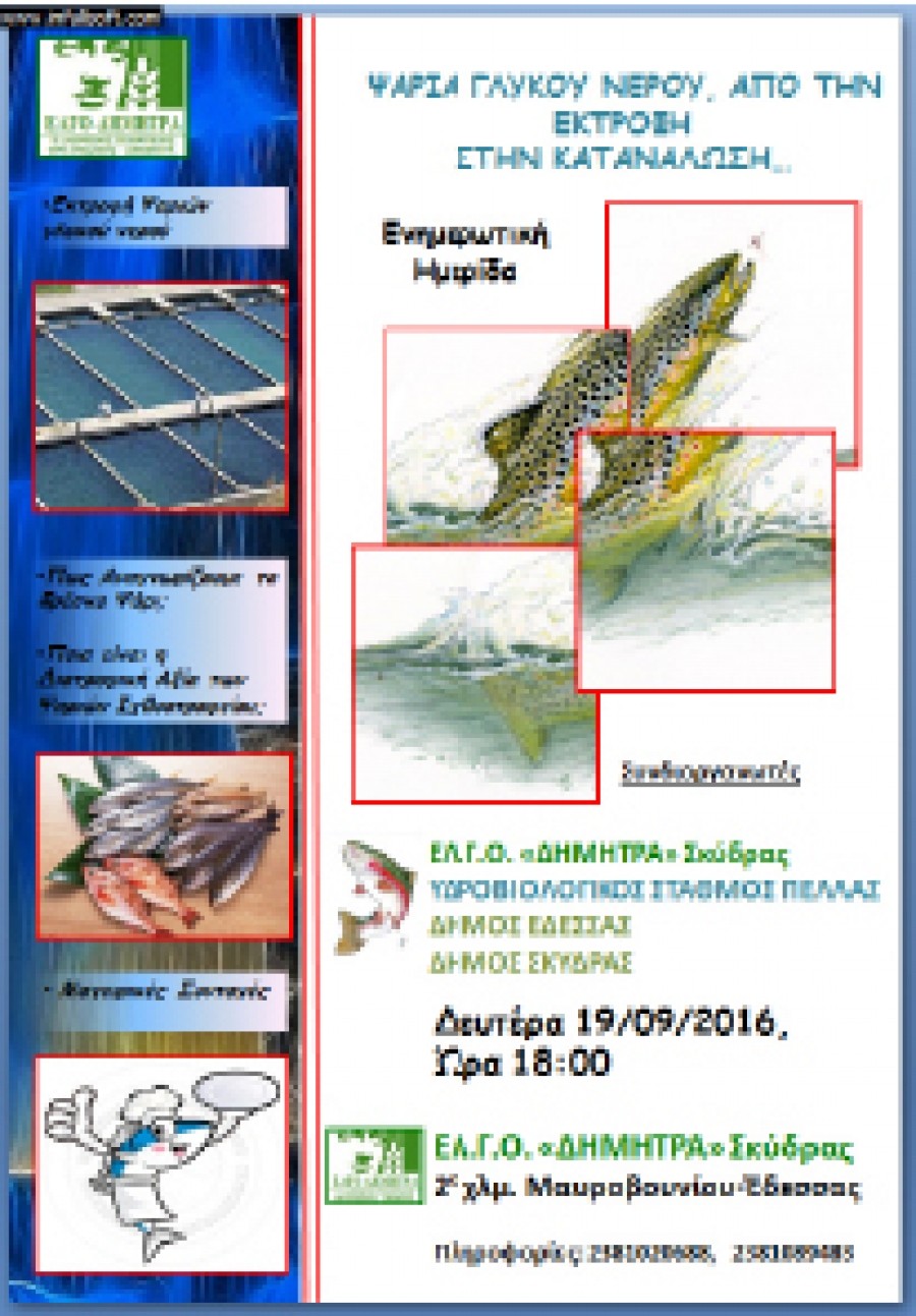 Το Κέντρο «ΔΗΜΗΤΡΑ» Σκύδρας σε συνεργασία με τον Υδροβιολογικό Σταθμό Πέλλας, το Δήμο Σκύδρας και το Δήμο Έδεσσας θα πραγματοποιήσει εκπαιδευτική – ενημερωτική ημερίδα με θέμα: «Ψάρια γλυκού νερού – από την εκτροφή στην κατανάλωση».