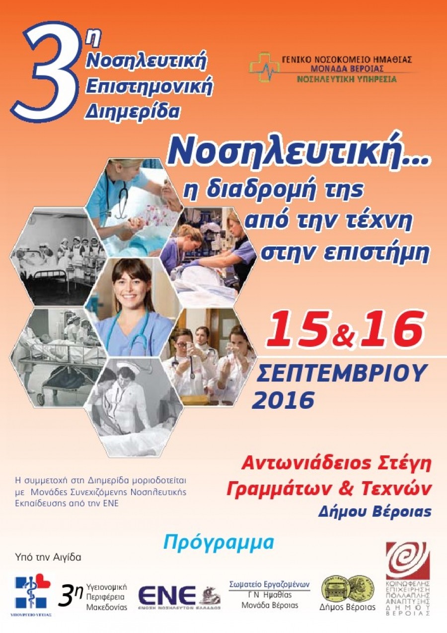 Στις 15 και 16 Σεπτεμβρίου θα πραγματοποιηθούν στην Αντωνιάδειο Στέγη Γραμμάτων και Τεχνών του δήμου Βέροιας οι εργασίες της 3ης Νοσηλευτικής Επιστημονικής Διημερίδας με θέμα: “Νοσηλευτική, η διαδρομή της από την τέχνη στην επιστήμη”. Οργάνωση: Διεύθυνση Νοσηλευτικής Υπηρεσίας Νοσοκομείου Ημαθίας- Μονάδα Βέροιας.
