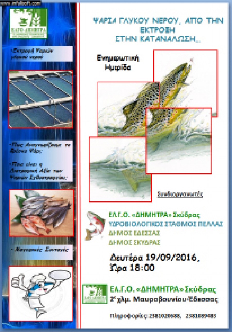 Το Κέντρο «ΔΗΜΗΤΡΑ» Σκύδρας σε συνεργασία με τον Υδροβιολογικό Σταθμό Πέλλας, το Δήμο Σκύδρας και το Δήμο Έδεσσας θα πραγματοποιήσει εκπαιδευτική – ενημερωτική ημερίδα με θέμα: «Ψάρια γλυκού νερού – από την εκτροφή στην κατανάλωση».