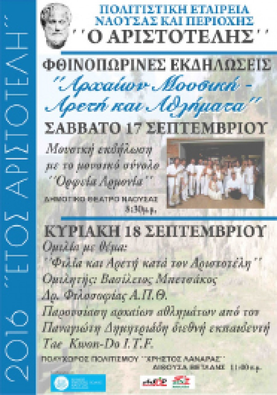 Στα πλαίσια ανακήρυξης, από την UNESCO του έτους 2016 ως “Έτους Αριστοτέλη” μετά από αίτημα της Ελληνικής Εθνικής Επιτροπής για την UNESCO και με στόχο τη σύνδεση της διδασκαλίας του Φιλοσόφου με τη σημερινή πραγματικότητα διοργανώνουμε σειρά εκδηλώσεων με τίτλο“ΦΘΙΝΟΠΩΡΙΝΕΣ ΕΚΔΗΛΩΣΕΙΣ ΑΡΙΣΤΟΤΕΛΗ”