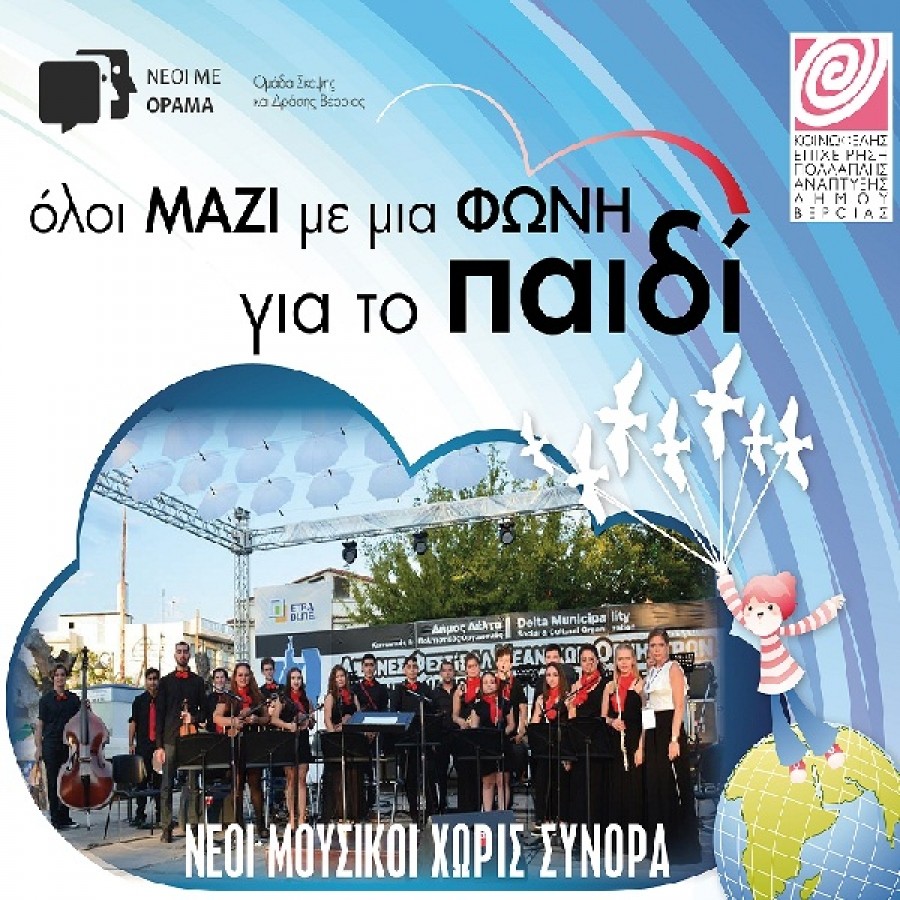 Συναυλία τα έσοδα της οποίας θα διατεθούν στον Σύλλογο Γονέων & Κηδεμόνων Σχολείου Ειδικής Αγωγής Βέροιας, στην Πρωτοβουλία για το Παιδί και στον Σύλλογο Προστασίας Απόρου Παιδιού, οργανώνουν απόψε στις 9 στο Θέατρο Άλσους οι «Νέοι με Όραμα» σε συνεργασία με την ΚΕΠΑ.