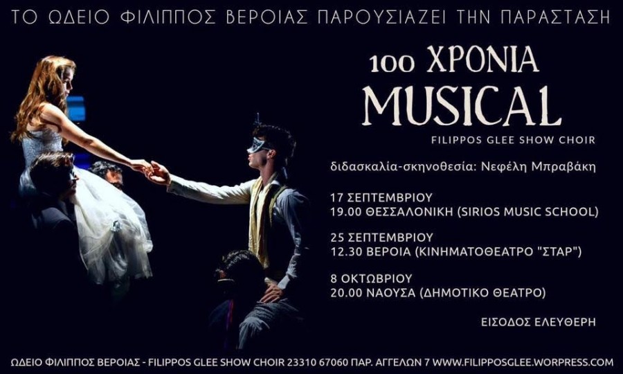 Η μουσική ομάδα της Νεφέλης Μπραβάκη «Filippos Glee», έπειτα από τις δύο επιτυχημένες παραγωγές που παρουσίασε την προηγούμενη ακαδημαϊκή χρονιά και την εξαιρετική της εμφάνιση στο Διεθνές Φεστιβάλ Χορωδιών του Μεγάρου Μουσικής Θεσσαλονίκης, κάνει τη φετινή της πρώτη εμφάνιση με τη νέα παράσταση «100 χρόνια musical» που θα παρουσιαστεί την Κυριακή στις 12.30 το μεσημέρι στο κινηματοθέατρο «ΣΤΑΡ» στη Βέροια και το Σάββατο 8 Οκτωβρίου στις 8 το βράδυ στο Δημοτικό Θέατρο της Νάουσας.