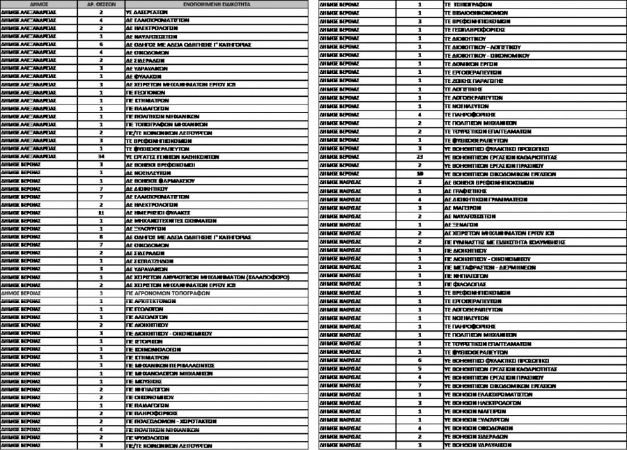 Σε επίπεδο Ημαθίας, ο Δήμος Βέροιας μέσω του προγράμματος θα προσλάβει 310 ανέργους σε δύο οκτάμηνα, ο Δήμος Νάουσας θα καλύψει 168 θέσεις και ο Δήμος Αλεξάνδρειας 73 θέσεις. (Οι ειδικότητες που ανακοινώθηκαν δημοσιεύονται στον παρακάτω πίνακα.)