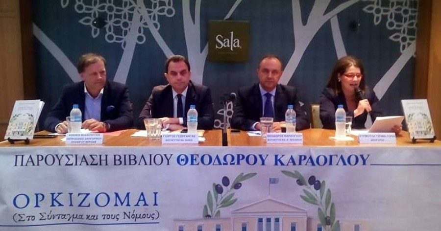 Πολιτική πυξίδα για το μέλλον της χώρας και σημαντική συμβολή στον δημοκρατικό διάλογο για την αναθεώρηση του Συντάγματος χαρακτηρίστηκε μεταξύ άλλων από τους ομιλητές το βιβλίο ΄Ορκίζομαι΄, του Θόδωρου Καράογλου, που έκανε το βράδυ του Σαββάτου την πρώτη του παρουσίαση στη Βέροια. “Με 19 προτάσεις για την αναθεώρηση του Συντάγματος και στόχο τη θεμελίωση της εμπιστοσύνης μεταξύ πολιτών και πολιτικού συστήματος”, όπως είπε ο συγγραφέας του, συναισθηματικά φορτισμένος από την παρουσία τόσων πολλών και καλών φίλων στη Sala της Εληάς.