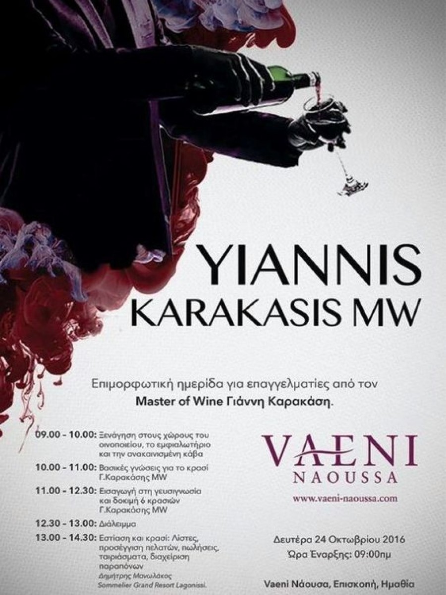 Επιμορφωτική ημερίδα για όλους τους επαγγελματίες της περιοχής διοργανώνει το Vaeni Naoussa σε συνεργασία με τον Master of Wine Yiannis Karakasis MW τη Δευτέρα 24 Οκτωβρίου στις 9 το πρωί, στην αίθουσα γευσιγνωσίας του Οινοποιητικού Συνεταιρισμού στην Επισκοπή Νάουσας.