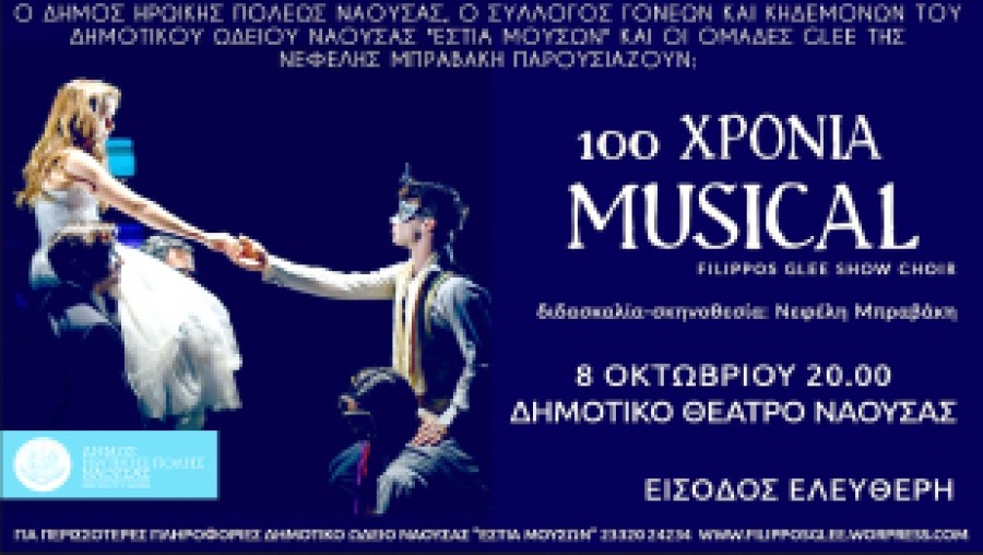Ο Δήμος Ηρωικής Πόλης Νάουσας, ο Σύλλογος Γονέων και Κηδεμόνων του Δημοτικού Ωδείου Νάουσας “Εστία Μουσών” και οι μουσικές ομάδες Glee του Δημοτικού Ωδείου Νάουσας και του Ωδείου Φίλιππος παρουσιάζουν την μουσικοχορευτική παράσταση “100 χρόνια musical”, το Σάββατο 8 Οκτωβρίου στις 20:00 το βράδυ στο Δημοτικό Θέατρο Νάουσας.