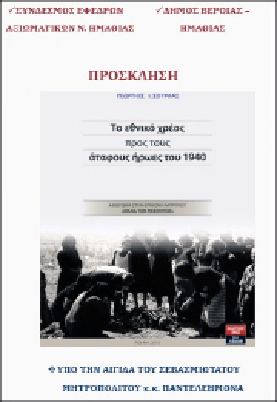 Εκδηλώσεις μνήμης για τους 7.976 πεσόντες – ήρωες κατά το Έπος 1940 – 41, που παραμένουν άταφοι στα πεδία των μαχών της Βορείου Ηπείρου, διοργανώνουν την Κυριακή 23 Οκτωβρίου 2016 ο Σύνδεσμος Εφέδρων Αξιωματικών Ημαθίας και ο Δήμος Βέροιας, υπό την Αιγίδα του Μητροπολίτη κ. Παντελεήμονα, σύμφωνα με το παρακάτω πρόγραμμα: