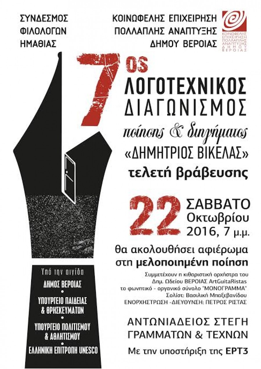 Με την τελετή βράβευσης στην Αντωνιάδειο Στέγη Γραμμάτων και Τεχνών το ερχόμενο Σάββατο στις 7μμ θα πέσει η αυλαία του 7ου λογοτεχνικού διαγωνισμού ποίησης και διηγήματος «Δημήτριος Βικέλας» της ΚΕΠΑ και του Συνδέσμου Φιλολόγων Ημαθίας. Θα παρευρεθούν τα μέλη της κριτικής επιτροπής:
