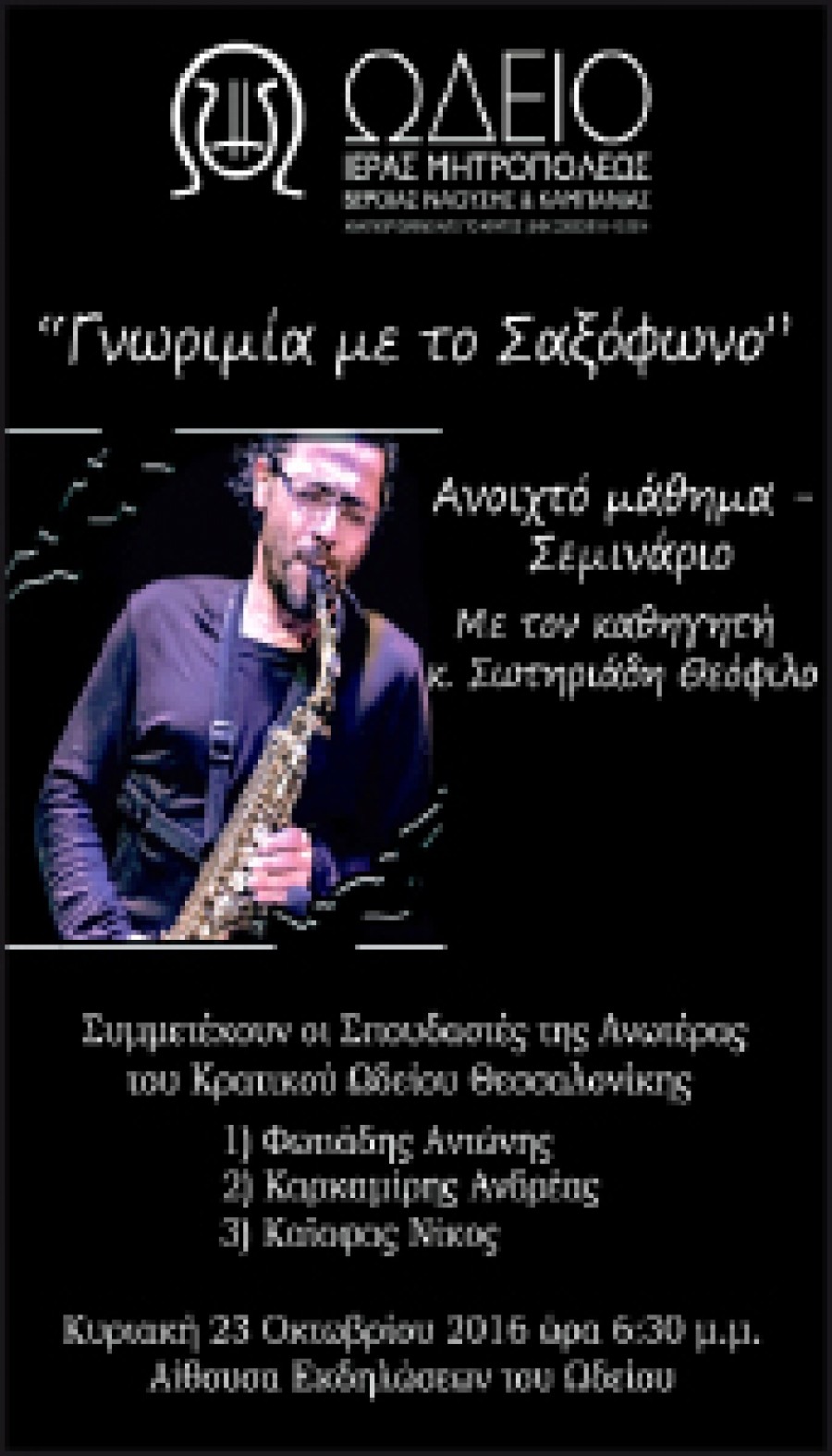 Στο ανοιχτό μάθημα  – σεμινάριο θα μιλήσει ο καταξιωμένος μουσικός κ. Σωτηριάδης Θεόφιλος για την ιστορία του Σαξοφώνου, τον ήχο και την κατασκευή του και θα θίξει θέματα που απασχολούν κάθε σπουδαστή που ενδιαφέρεται να σπουδάσει το Σαξόφωνο, καθώς επίσης θα απαντήσει σε τυχόν ερωτήσεις και απορίες των παρευρισκομένων, ενώ θα παίξουν και διάφορα μουσικά έργα.
