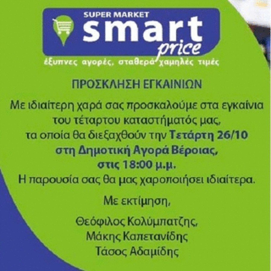 Σήμερα στις 6 το απόγευμα θα πραγματοποιηθούν τα εγκαίνια του σούπερ μάρκετ Smartστην παλιά δημοτική αγορά, σε μια έκταση 1.500 τ.μ. Στο κατάστημα με τις έξυπνες αγορές και τις σταθερά χαμηλές τιμές!