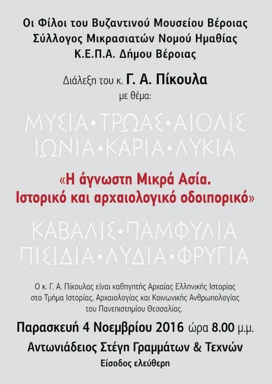 Διάλεξη του καθηγητή Γ.Α. Πίκουλα με θέμα «Η άγνωστη Μικρά Ασία. Ιστορικό και αρχαιολογικό οδοιπορικό» συνδιοργανώνουν οι Φίλοι του Βυζαντινού Μουσείου Βέροιας, ο Σύλλογος Μικρασιατών Ημαθίας και η ΚΕΠΑ δήμου Βέροιας. Η διάλεξη θα πραγματοποιηθεί την Παρασκευή 4 Νοεμβρίου στις 8.00μ.μ., στην Αντωνιάδεια Στέγη. Η είσοδος είναι ελεύθερη.