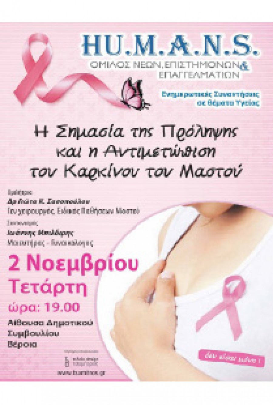 Ο Όμιλος Νέων, Επαγγελματιών και Επιστημόνων Ν.Ημαθιας στα πλαίσια του μηνα πρόληψης κατα του καρκίνου του μαστού οργανώνει μια ενημερωτικη Ημερίδα με θεμα «Η Σημασια της Πρόληψης και η Αντιμετώπιση του Καρκίνου του Μαστού» απο την Δρ Σασοπουλου Γιωτα, Διδακτορ ΑΠΘ, Χειρουργό- Ειδικό Παθήσεων Μαστού την Τεταρτη 2 Νοεμβρίου 2016 και ωρα 19.00 στην αίθουσα του Δημοτικού Συμβουλίου του Δ.Βεροιας.
