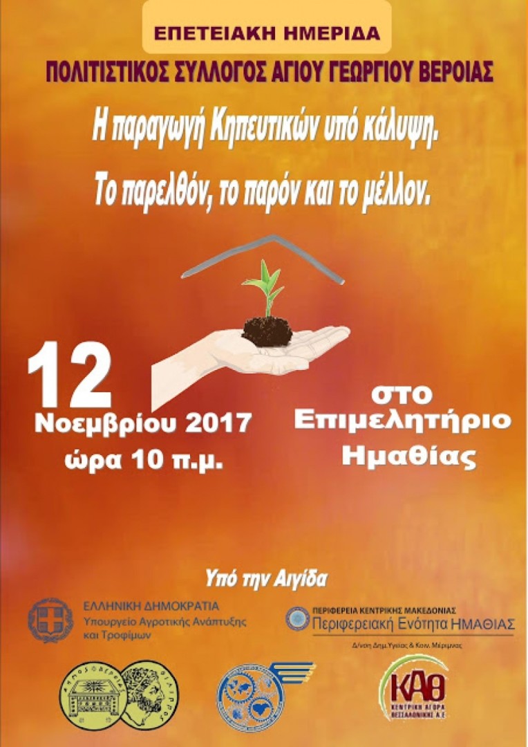 Με αφορμή την επέτειο 50 ετών καλλιέργειας κηπευτικών υπό κάλυψη (Θερμοκήπια) στον Άγιο Γεώργιο και σε συνέχεια των δράσεων του Πολιτιστικού Συλλόγου Αγίου Γεωργίου να αναδειχθούν και να προωθηθούν τα τοπικά προϊόντα, διοργανώνεται στις 12 Νοεμβρίου στις 10.00 π.μ. στο Επιμελητήριο Ημαθίας, μία επετειακή ημερίδα με θέμα «Καλλιέργεια Κηπευτικών υπό κάλυψη. Το παρελθόν, το παρόν και το μέλλον.»