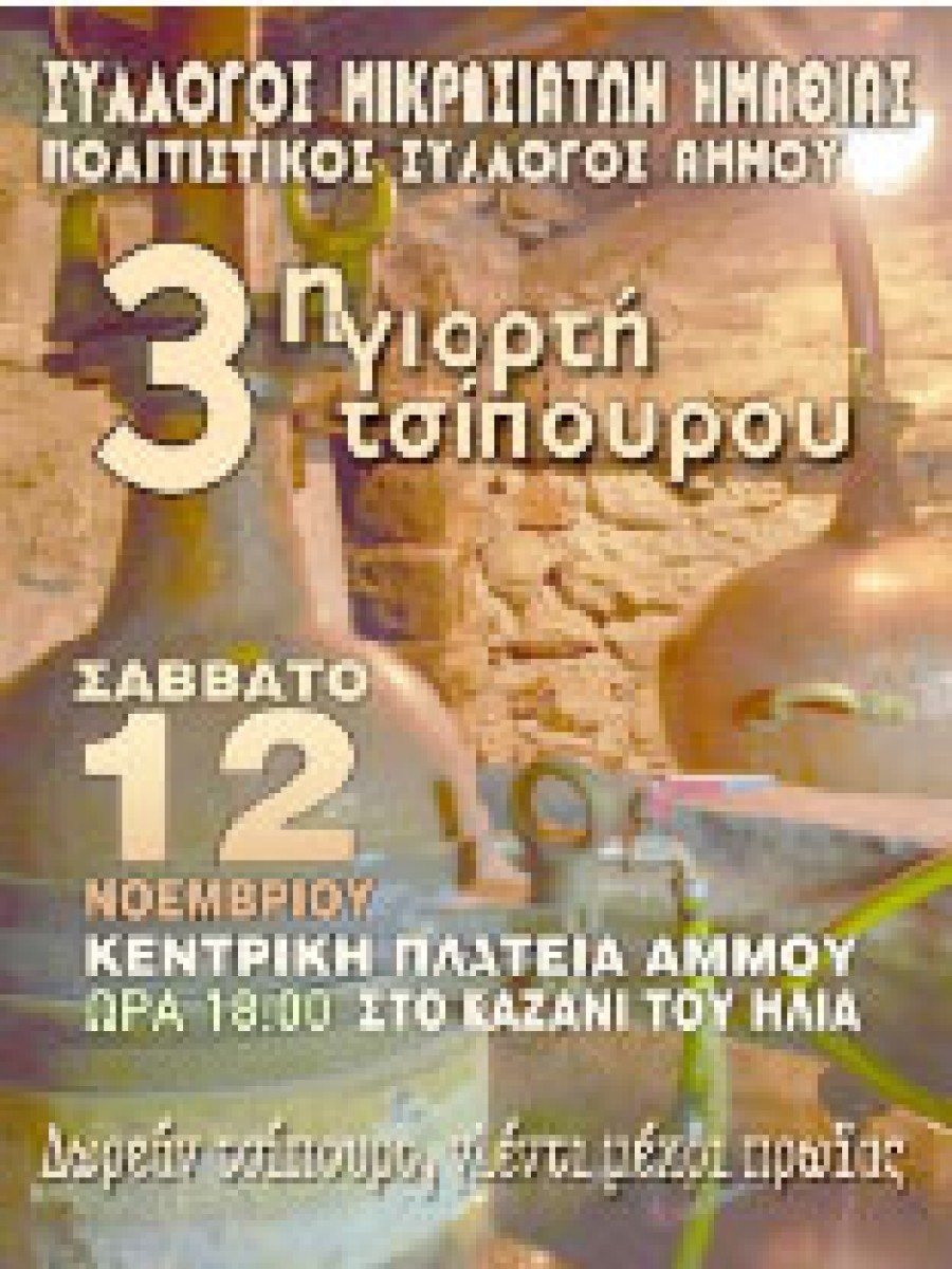 Ο Σύλλογος Μικρασιατών Ν. Ημαθίας και ο Πολιτιστικός Σύλλογος Άμμου διοργανώνουν στον Άμμο,  το Σάββατο 12 Νοεμβρίου 2016,την «3η Γιορτή Τσίπουρου». Από τις 6μμ στο «Καζάνι του Ηλία» δίπλα από την κεντρική πλατεία του Άμμου, θα διανέμεται δωρεάν εκλεκτό τσίπουρο. Γλέντι ,κέφι, χορός  και καλή διάθεση είναι οι προϋποθέσεις για ένα όμορφο βράδυ και για όσους γνωρίζουν από τσιπουροκατανύξεις!!!