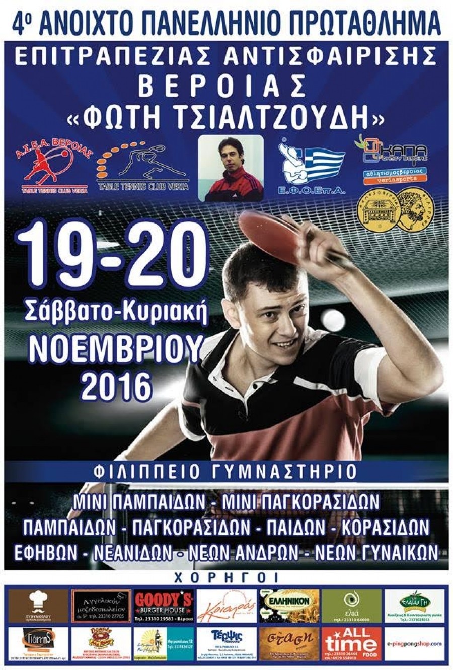 Οι σύλλογοι επιτραπέζιας αντισφαίρισης Α.Σ.Α.Β. και Ο.Ε.Α.Β. με τον δήμο Βέροιας οργανώνουν το Ετήσιο Πανελλήνιο τουρνουά στη μνήμη του αθλητή Φώτη Τσιαλτζούδη, το ερχόμενο Σάββατο, από τις 9 το πρωί ως τις 9 το βράδυ, και την Κυριακή από τις 9 το πρωί ως τις 5 το απόγευμα. Θα συμμετέχουν 257 αθλητές και αθλήτριες από 53 συλλόγους, από Αθήνα, Θεσσαλονίκη, Φλώρινα, Πάτρα, Κομοτηνή, Καστοριά, Καβάλα, Αλεξανδρούπολη, Σέρρες, Ορεστιάδα, Βόλο, Λάρισα, Κόρινθο, Χίο, Χανιά, Έδεσσα, Δράμα, Κοζάνη, Ιωάννινα και Βέροια.