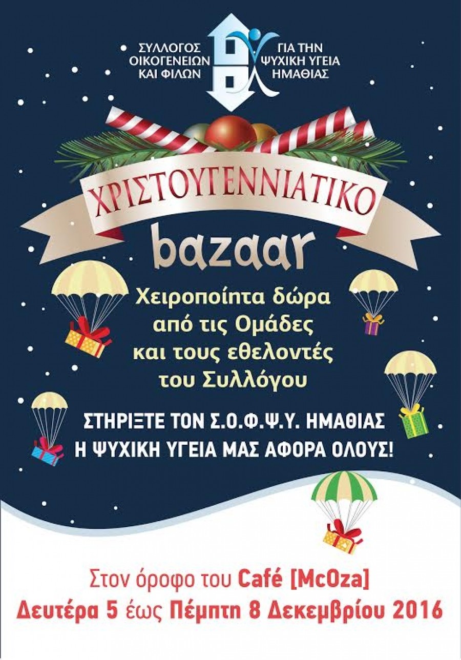 Έκθεση χειροποίητων δώρων από τις ομάδες και τους εθελοντές του ΣΟΦΨΥ Ημαθίας θα πραγματοποιηθεί από τη Δευτέρα 5 έως την Πέμπτη 8 Δεκεμβρίου στον όροφο του Café McOza.