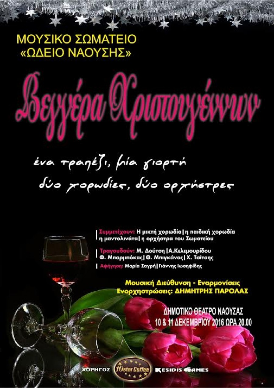 Η ετήσια συναυλία του «Ωδείου Ναούσης», όπως ο τίτλος της προϊδεάζει, θα έχει χρώμα χριστουγεννιάτικο. Κείμενα, τραγούδια, κάλαντα, εισάγουν τον θεατή στο πνεύμα των ημερών στην αρχή της παράστασης, για να δώσουν στη συνέχεια τη θέση τους στη «βεγγέρα». Το γιορτινό τραπέζι ζωντανεύει με τραγούδι και χορό, στολισμένο με ήχους και εικόνες εποχής. Θύμισες παλιές μα και παντοτινές. Λες και ήταν χθες…