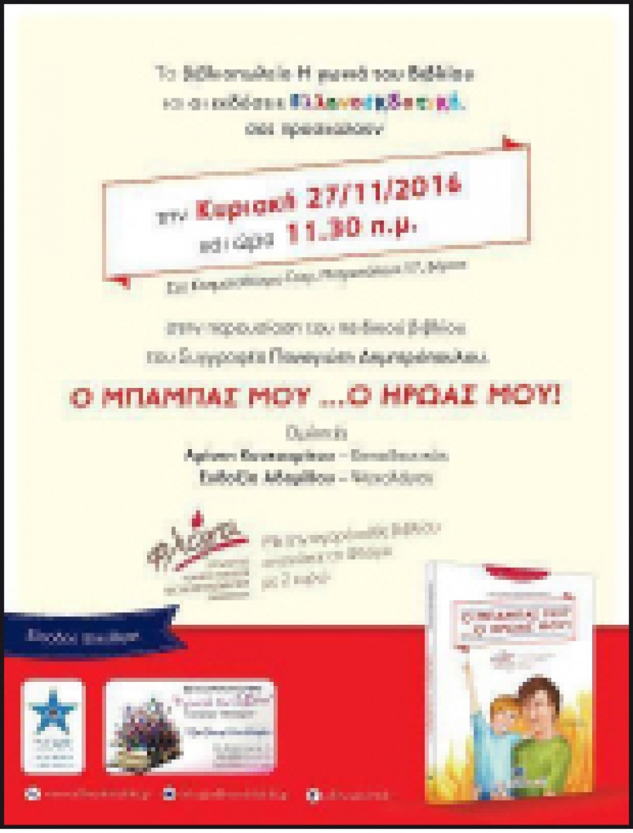 Ένα σφίξιμο στο χέρι του μπαμπά από μια μικροσκοπική παλάμη, ένα σφίξιμο στην καρδιά κάθε γονιού που μεγαλώνει το δικό του παιδί ή το παιδί κάποιου άλλου. Μία τρυφερή ιστορία που ευελπιστεί να τρυπώσει στη συνείδηση του ενήλικου κόσμου μας και να πετάξει από μέσα του όση σκληρότητα περισσεύει. Ένα ανάγνωσμα που προβληματίζει και ταυτόχρονα συγκινεί, που διδάσκει και ταυτόχρονα ψυχαγωγεί. Αυτά είναι με λίγα λόγια όλα όσα περιλαμβάνονται στο βιβλίο του Παναγιώτη Δημητρόπουλου με τίτλο “Ο Μπαμπάς μου… Ο Ήρωάς μου” (εκδόσεις Ελληνοεκδοτική). Ένα βιβλίο με διπλά καλό σκοπό καθώς πέρα από το δίδαγμα ότι “γονιός δεν είναι απαραίτητα όποιος γεννά παιδιά αλλά εκείνος που συνειδητά ζει για τα παιδιά του”, με την αγορά κάθε βιβλίου 2 ευρώ διατίθενται στον Σύλλογο Γονιών Παιδιών με Νεοπλασματική Ασθένεια “ΦΛΟΓΑ” για τη στήριξη της εκστρατείας καταπολέμησης του παιδικού καρκίνου. Το βιβλίο παρουσιάζεται στην αίθουσα 2 του κιν/τρου ΣΤΑΡ στη Βέροια την Κυριακή 27 Νοεμβρίου στις 11.30 το πρωί.