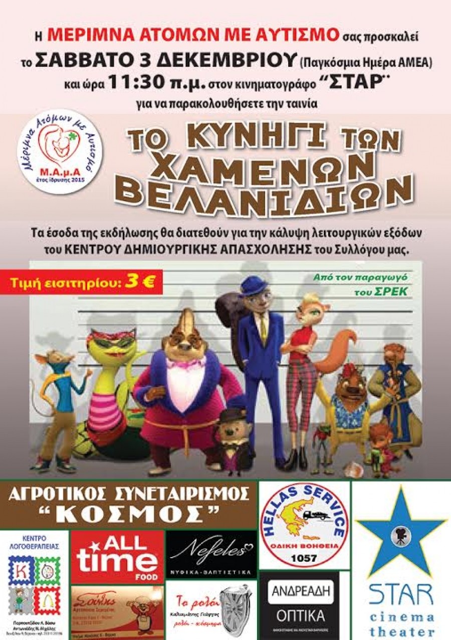Η προβολή της ταινίας ΄Το κυνήγι των χαμένων βελανιδιών΄ θα γίνει από τη Μέριμνα Ατόμων με Αυτισμό το Σάββατο 3 Δεκεμβρίου και ώρα 11:30πμ στον κινηματογράφο Σταρ. Τιμή εισιτηρίου 3 ευρώ. Στον ίδιο χώρο θα πραγματοποιηθεί και χριστουγεννιάτικο μπαζάρ με χειροποίητα μοναδικά γούρια φτιαγμένα με πολλή αγάπη από τις φίλες και εθελόντριες του συλλόγου. Τα έσοδα από την προβολή της ταινίας και του μπαζάρ, θα δοθούν στο σύλλογο για την κάλυψη των λειτουργικών εξόδων του Κέντρου Δημιουργικής Απασχόλησης.
