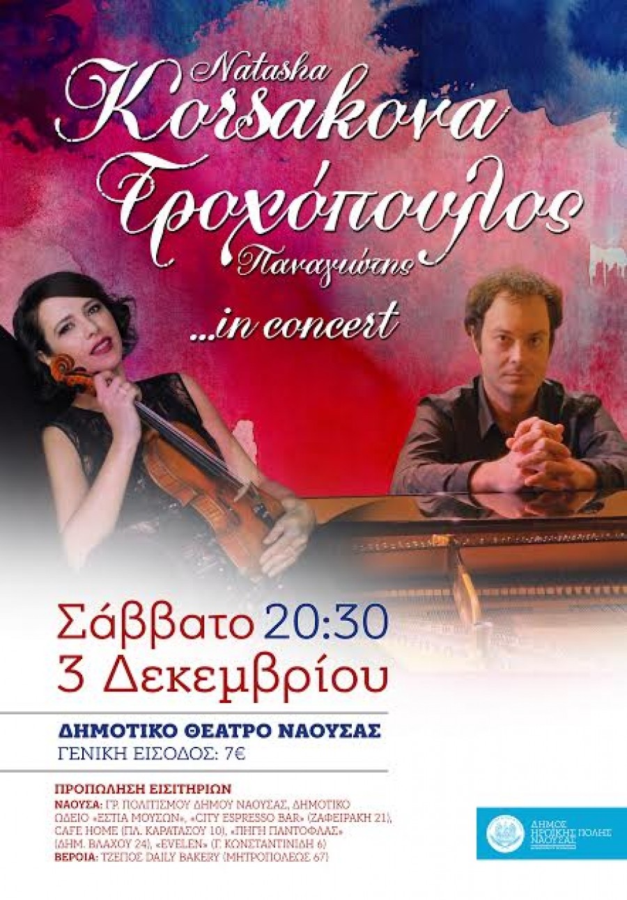 Τη διεθνούς φήμης βιολονίστρια Νατάσα Κορσάσκοβα και τον καταξιωμένο πιανίστα Παναγιώτη Τροχόπουλο παρουσιάζει το Σάββατο 3 Δεκεμβρίου ο δήμος Νάουσας, σε μία μοναδική μουσική συναυλία, στην οποία το κοινό θα έχει την ευκαιρία να απολαύσει μία εκδήλωση ιδιαίτερα υψηλού επιπέδου από καλλιτέχνες καταξιωμένους στο διεθνές στερέωμα. Θα ερμηνεύσουν έργα Μπετόβεν, Μπαχ, Μπραμς, Προκόφιεφ, Ραχμάνινοφ κ.ά.