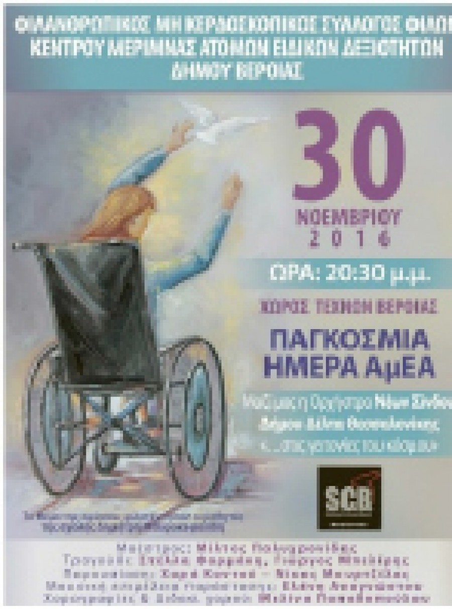 Σήμερα Τετάρτη 30 Νοεμβρίου στις 8.30 μ.μ. πραγματοποιείται η καθιερωμένη μεγάλη μουσική παράσταση του Συλλόγου Φίλων Κέντρου Μέριμνας Ατόμων Ειδικών Δεξιοτήτων Δήμου Βέροιας (ΚΕΜΑΕΔ), με αφορμή την Παγκόσμια Ημέρα ΑμΕΑ. Η εκδήλωση θα γίνει όπως κάθε χρόνο στον Χώρο Τεχνών, σε συνδιοργάνωση με το ΚΑΠΑ Βέροιας και με την υποστήριξη της ΚΕΠΑ, καθώς και του Ιατρικού και Δικηγορικού Συλλόγου Βέροιας. Στη φετινή παράσταση, τα παιδιά του Κέντρου θα συνοδεύει η Ορχήστρα Νέων Σίνδου του δήμου Δέλτα Θεσσαλονίκης, που θα ταξιδέψει το κοινό ‘’…στις γειτονιές του κόσμου’’.Η αφίσα της εκδήλωσης είναι φιλοτεχνημένη από τους μαθητές της Σχολής Ζωγραφικής του Δημήτρη Μαυροκεφαλίδη. Μία αφίσα που θέλει να περάσει το μήνυμα της ελπίδας, ένα μήνυμα που διατηρούν ζωντανό τα παιδιά της Μέριμνας, δίνοντας καθημερινά το δικό τους αγώνα και κερδίζοντας τον θαυμασμό όλων μας.