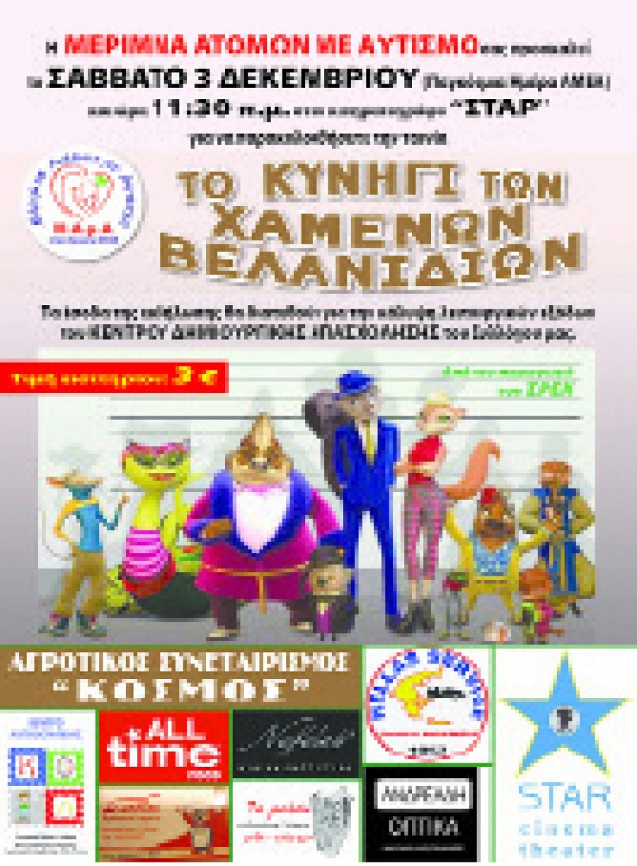 Η Μέριμνα Ατόμων με Αυτισμό παρουσιάζει στο κινηματογράφο Σταρ το Σάββατο 3 Δεκεμβρίου στις 11:30 π.μ τη ταινία ‘ΤΟ ΚΥΝΗΓΙ ΤΩΝ ΧΑΜΕΝΩΝ ΒΕΛΑΝΙΔΙΩΝ’. Τιμή εισητηρίου 3 ευρώ. Εκεί θα πραγματοποιηθεί και χριστουγεννιάτικο μπαζάρ με χειροποίητα μοναδικά γούρια φτιαγμένα με πολλή αγάπη από τις φίλες και εθελόντριες του συλλόγου. Τα έσοδα από τη προβολή της ταινίας και του μπαζάρ, θα δοθούν στο σύλλογο Μ.Α.μ.Α. για την κάλυψη των λειτουργικών εξόδων του Κέντρου Δημιουργικής Απασχόλησης των παιδιών.
