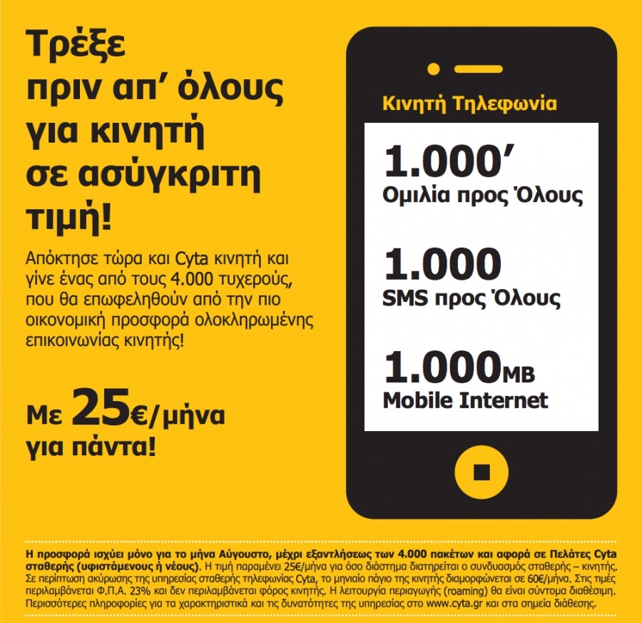 Με νέο προνομιακό προϊόν Κινητής, «πάλι σ’ έφτιαξε η Cyta», σύμφωνα με το σλόγκαν της διαφημιστικής της καμπάνιας, με γνώμονα πάντα την οικονομία και την ευελιξία.  Το νέο πρόγραμμα Συμβολαίου Κινητής κάνει την… «απόλαυση να διαρκεί περισσότερο» καθώς προσφέρει 1000’ λεπτά Ομιλίας προς Όλους ή αλλιώς πάνω από 16 ώρες ομιλίας από το Κινητό προς όλα τα εθνικά δίκτυα, Σταθερά και Κινητά, μόνο με 13€ το μήνα!