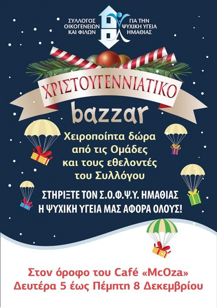 Από τη Δευτέρα 5 ως την Πέμπτη 8 Δεκεμβρίου, στον όροφο του Cafe McOza, θα βρίσκεται το χριστουγεννιάτικο bazzar του ΣΟΦΨΥ Ημαθίας. Μια έκθεση χειροποίητων δώρων από τις Ομάδες και τους εθελοντές του Συλλόγου Οικογενειών και Φίλων για την Ψυχική Υγεία Ν. Ημαθίας, που όλοι πρέπει να τιμήσουμε.