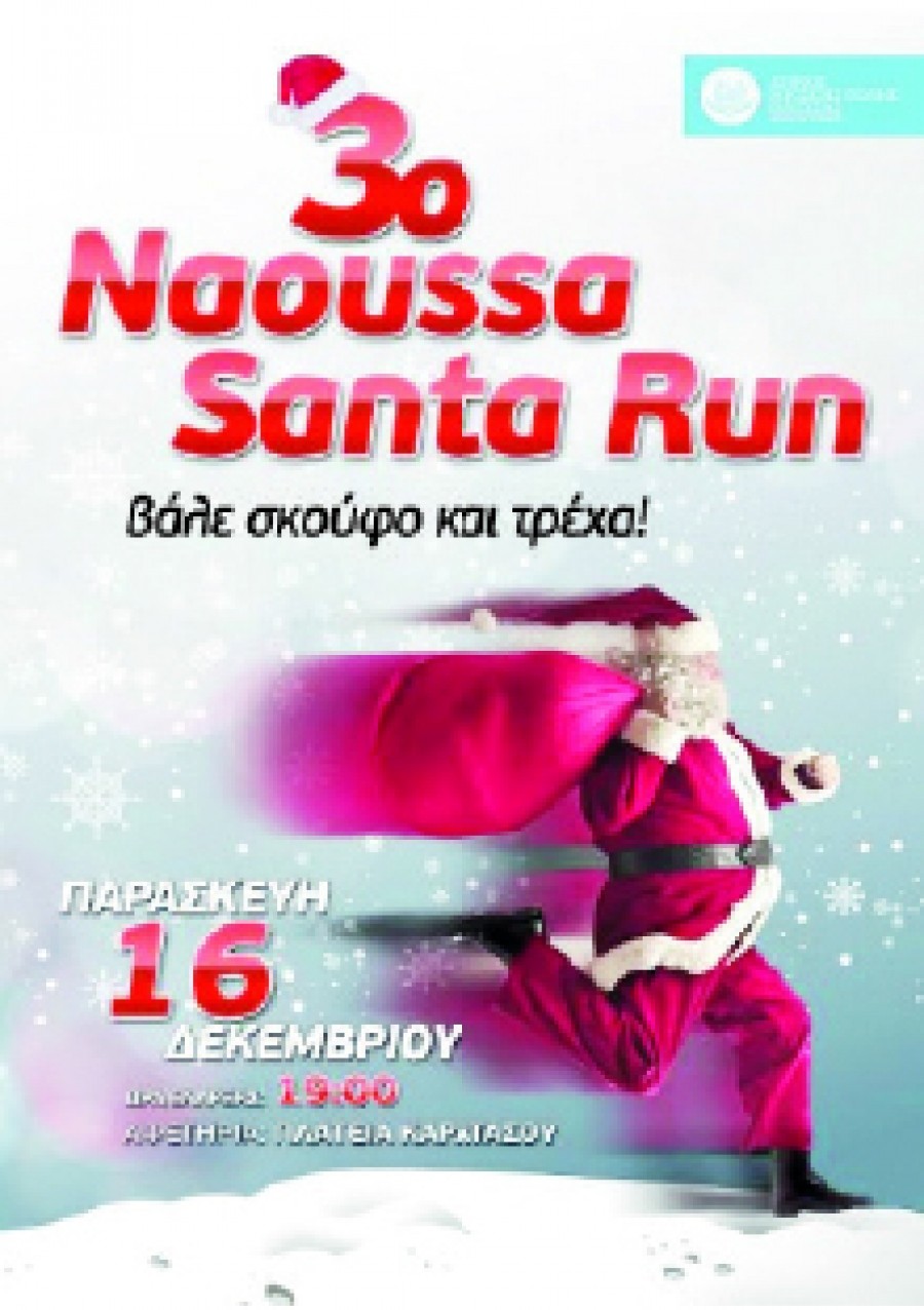 Τον 3ο αγώνα «Naoussa Santa Run» διοργανώνει για τρίτη συνεχή χρονιά ο δήμος Νάουσας, απόστασης περίπου 1.700 μ., που θα διεξαχθεί την Παρασκευή 16 Δεκεμβρίου στις 7 το απόγευμα με αφετηρία την Πλατεία Καρατάσου.