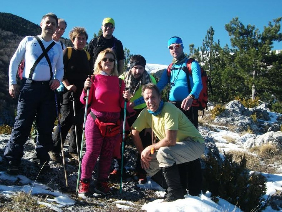 Ορειβατούμε τώρα στην κόψη της κορυφογραμμής στα δεξιά μας γκρεμός, το κρύο έντονο αλλά η θέα πανέμορφη, κάτω χαμηλά το Λιτόχωρο και η παραλία της Πιερίας. Ο κρύος αέρας που στροβιλίζει στις πλαγιές μας κοκκινίζει πρόσωπο και μάγουλα, ο χειμώνας με το αληθινό πρόσωπο είναι εδώ και μας ταλαιπωρεί!