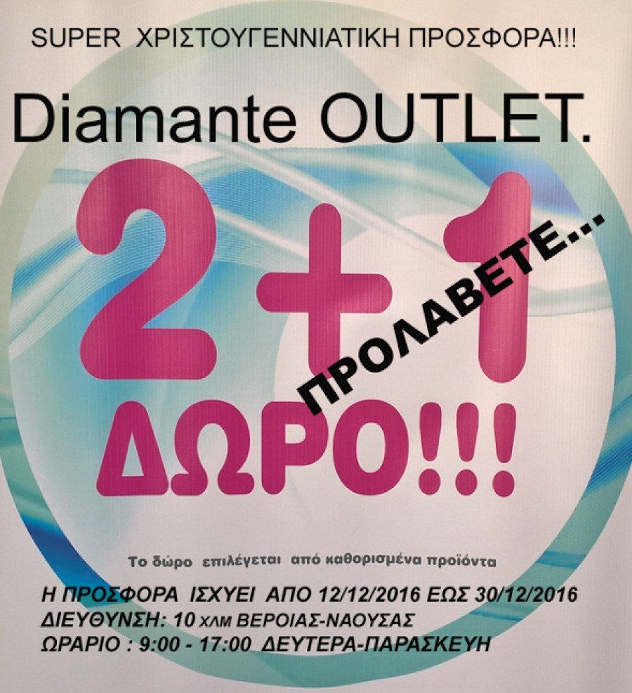 To OUTLET κατάστημα της εταιρείας Diamante ενόψει των Χριστουγέννων προσφέρει με την αγορά 2 προϊόντων 1 ακόμη δωρεάν. Εκμεταλλευτείτε την απίθανη προσφορά η οποία ισχύει από 12/12 ως 30/12/2016 για να κάνετε δωράκια σε όλα τα αγαπημένα σας πρόσωπα χωρίς να χρειαστεί να ξοδέψετε πολλά χρήματα. Μεγάλη ποικιλία σε αντρικά, γυναικεία και παιδικά casual ρούχα, κατάλληλα για τις ανάγκες της καθημερινής σας εμφάνισης. (Η προσφορά ισχύει μόνο για το OUTLET κατάστημα.)
