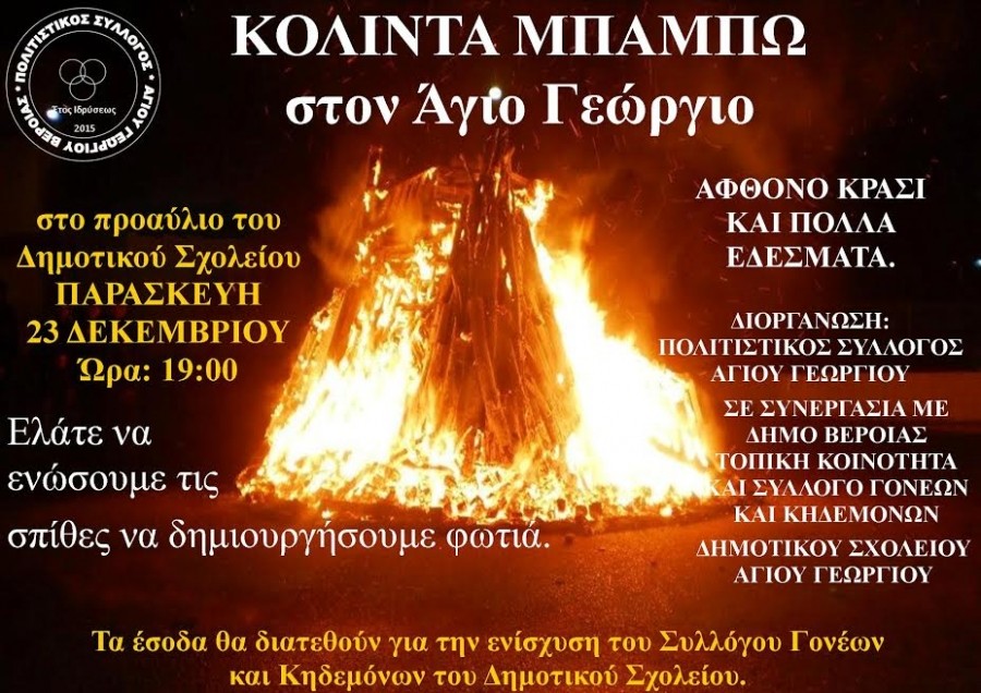 Την αναβίωση του εθίμου “Κόλιντα Μπάμπω” οργανώνει την Παρασκευή στις 7μμ στον προαύλιο χώρο του δημοτικού σχολείου Αγίου Γεωργίου, ο Πολιτιστικός Σύλλογος Αγίου Γεωργίου, σε συνεργασία με τον δήμο Βέροιας, την Τοπική Κοινότητα και τον Σύλλογο Γονέων και Κηδεμόνων του δημοτικού σχολείου. Οι επισκέπτες θα έχουν την ευκαιρία να απολαύσουν πολλά εδέσματα και άφθονο κρασί, ενώ η χορωδία του δημοτικού σχολείου θα τους ταξιδέψει με χριστουγεννιάτικα ηχοχρώματα. Φημολογείται πως κατά τη διάρκεια της εκδήλωσης θα μας επισκεφτεί ο Άγιος Βασίλης φέρνοντας δώρα για όλα τα παιδιά.
